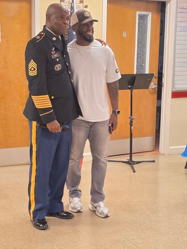 Patrick Dias receiving our donations from Harvey Taylor.